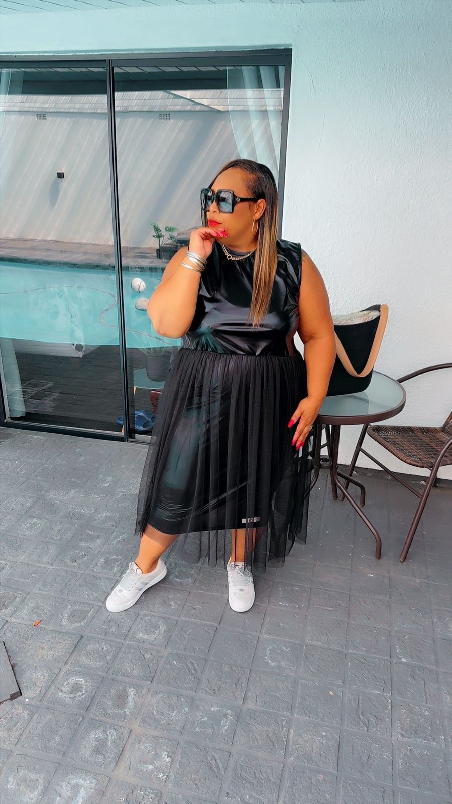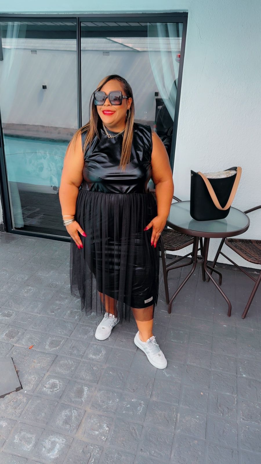 ✨ A sleeveless faux-leather top with soft tulle overlay for a touch of feminine drama