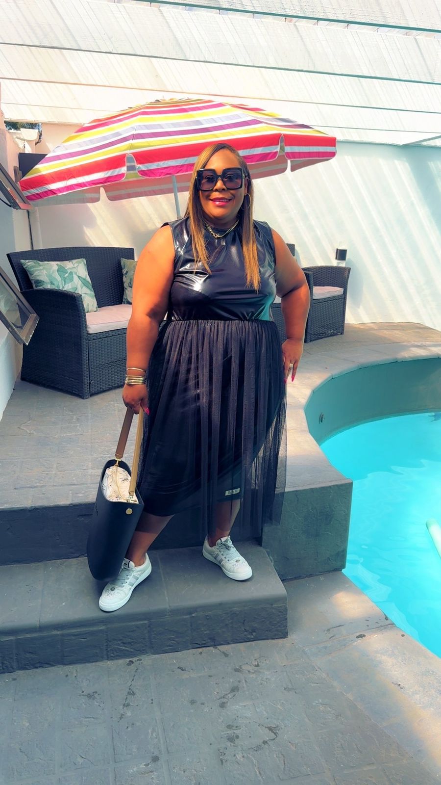 The structured leather look brings bold sophistication, while the flowing tulle softens the silhouette for a perfectly balanced finish.